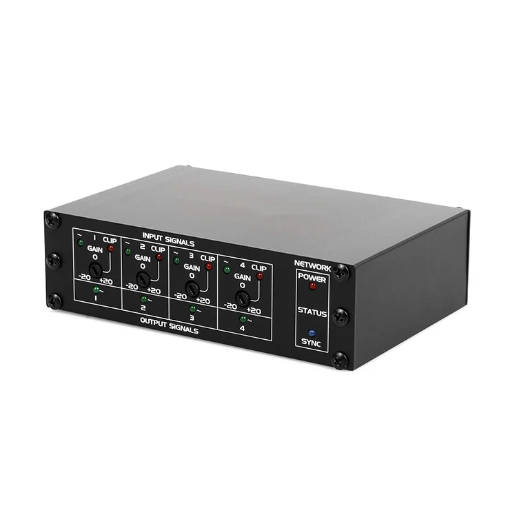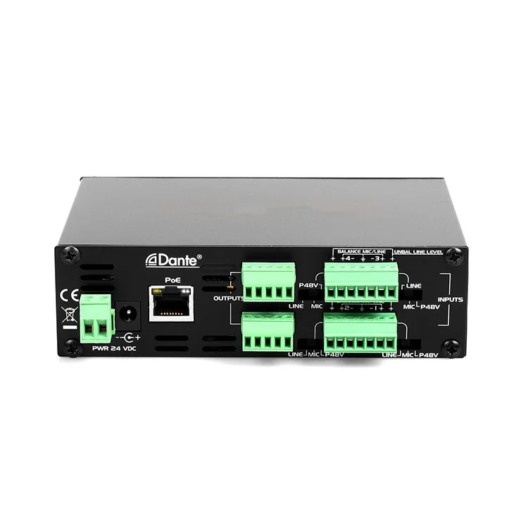 ממשק דנטה של 4 מיקרופון וקו הוא ממשק שמע מקצועי המבוסס על פרוטוקול רשת DANTE, התומך ב -4 כניסות מיקרופון/קו ו -4 יציאות. היתרון העיקרי שלה הוא להעביר אותות שמע באיכות גבוהה ונמוכה עם רשתות נמוך דרך רשתות IP, המתאימות לתרחישים הדורשים חיווט גמיש, העברה מרחוק או שילוב שמע רב-ערוצי. זה מתאים להפקת צליל חי, דרכים/סטרימינג, מערכת ועידה, מקומות חינוך מתאימים וכן הלאה.